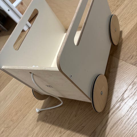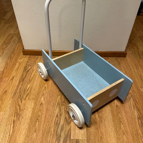 IKEA lasten leikkikärry, valmistettu puusta, vihreä väri. Kärryssä on neljä pyörää ja työntökahva, suunniteltu lasten leikkeihin ja kävelyn tukemiseen.