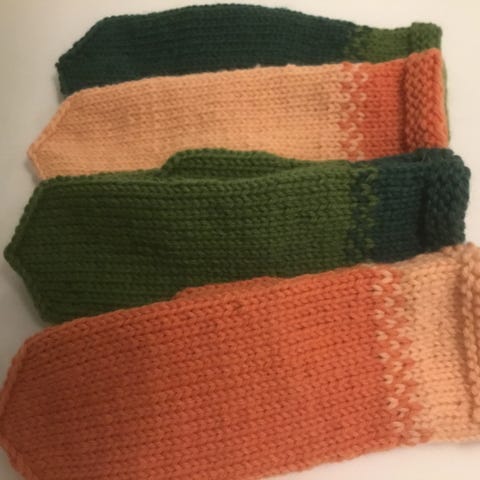 Vasemmalta kahdet neulottu Nalle langasta ja oikean puoleiset 7-veljestä Isoveli langasta.