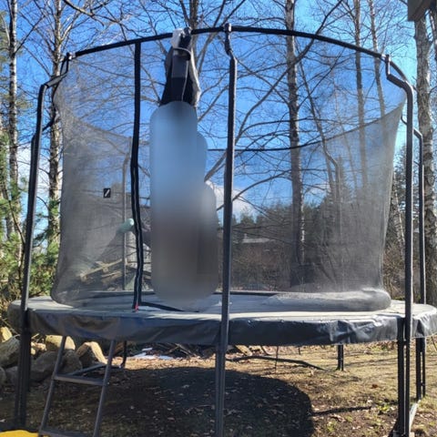Vielä paketissa, koska maa trampoliinin alla on peruskalliota, niin siihen ei maakiilaa laiteta :)