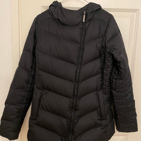 Hyvässä kunnossa oleva Marmotin untuvatakki, koko S. Vasemmassa hihassa pieni tahra (kts. kuva), kauluksessa ja hihansuissa pientä tummentumaa. Ei ole koitettu pestä. Muuten moitteeton kunto. Vetoketjutaskut, helmassa kiristysnauha.