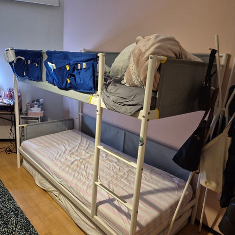Myytävänä kuvan kaksi IKEA KURA lasten sänkyä, jotka ovat olleet pinottuna kerrossängyksi.
