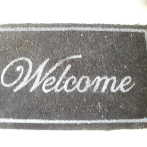 Musta hieno ovimatto, jossa hopeinen englanninkielinen tervetuloa-teksti ja sen alla hopeinen ornamenttinen kiehkura. Koko 40 x 58 cm. Pyöristetyt kulma. Takapuolen materiaali liukumista estävää mattokumia. Myynnissä Lohjalla, mutta kulkeutuu omien menojen mukaan Kamppiin, Espoon keskukseen tai Espoon Ikealle. Myynnissä myös muualla. Hp. 10 euroa.