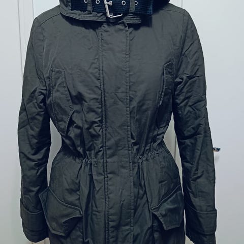 Seppälä musta talvitakki, koko L (kai-kai n. 60cm, olka-helma n. 92cm). Ei älyttömän paksu, mutta jonkinlainen vuorikangas on.