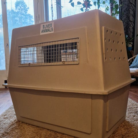 Matkakaukalo kuljetuslaatikko harmaa, valmistettu muovista. Sopii eläinten kuljetukseen, varustettu metalliverkolla ovessa ja tuuletusaukoilla sivuilla.