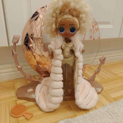 L.O.L. Surprise lasten lelu, sisältää pienen nuken ja pienen kassin. Nukella on ruskea iho, violetti hiuslakki ja pinkit vaatteet. Käsilaukku on valkoinen, jossa on pääkallokuvioita Día de Muertos -tyyliin ja keltainen kahva.