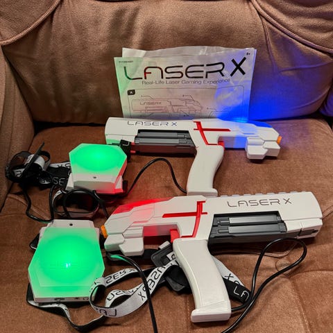 Myydään toimivat, paristokäyttöiset Lazermad -laseraseet ja paitaan kiinnitettävät maalitaulut, joissa valotehosteet ja äänet. Aseiden kantama 15 m, voidaan käyttää sisällä ja ulkona. Käyttöohjeet mukana.