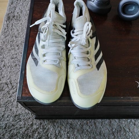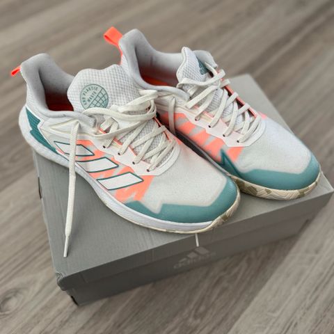 Melkein uusi, puhdas vain pari kertaa käytetyt kengät Adidas Lightstrike, koko 37 1/3. Eivät sovi kasvavan vaivaisluun takia. Ovat muuten leveälestinen, mutta jämäkät, tukevat hyvin nilkkaa pallopelissä. Sopii muihinkin pallopeleihin kuin padel tai tennis.