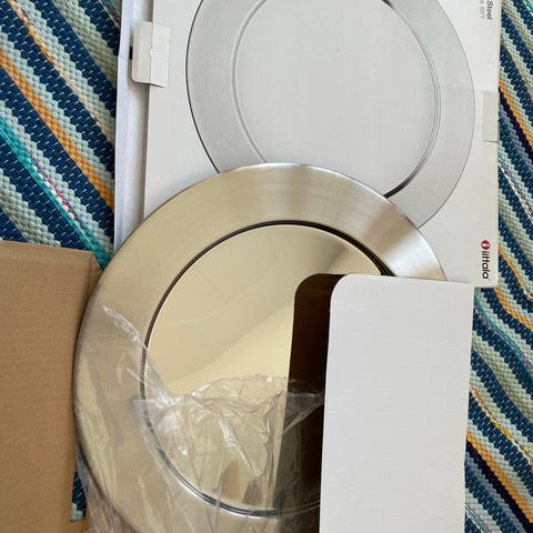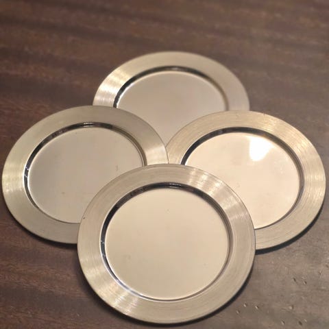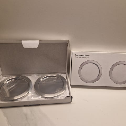 4 kpl Sarpaneva Steel lasinalusia 4 kpl. Myydään vain yhdessä, yhteishinta. Hyväkuntoiset, pientä kulumaa tullut käytössä, näkyy kuvissa. Halkaisija 9cm, ilman reunoja 7cm.