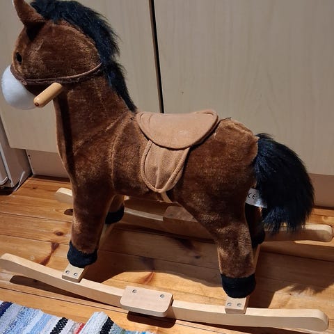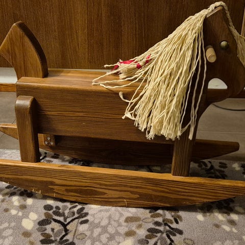 Kotimaista työtä oleva keinuhevonen, ehjä ja kunnostettu. Materiaali on mäntyä ja synteettistä hamppuköyttä. Hevonen on purettu osiin, hiottu ja vahattu harmaalla OsmoColorilla. Harja ja häntä on vaihdettu. ”Satulan” korkeus maasta on noin 26 cm. Kokonaiskorkeus on 57 cm ja jalasten pituus 70 cm. Toimitustapana myös nouto ja käteiskauppa ovat mahdolliset.