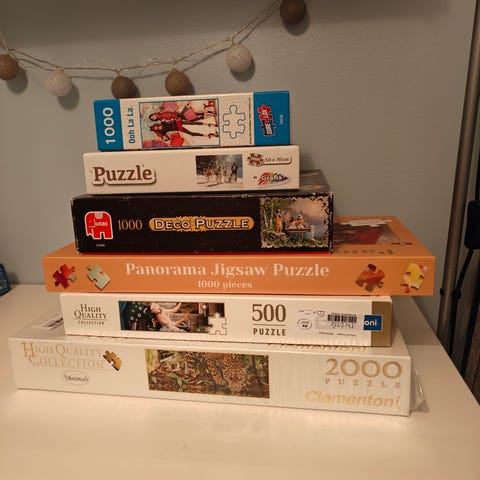 Päällimmäinen palapeli kerran koottu, muut iskemättömissä pakkauksissa.