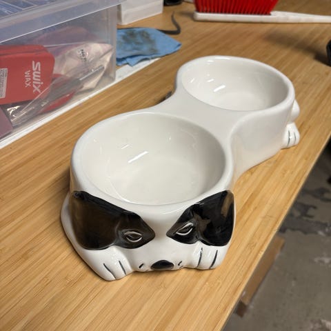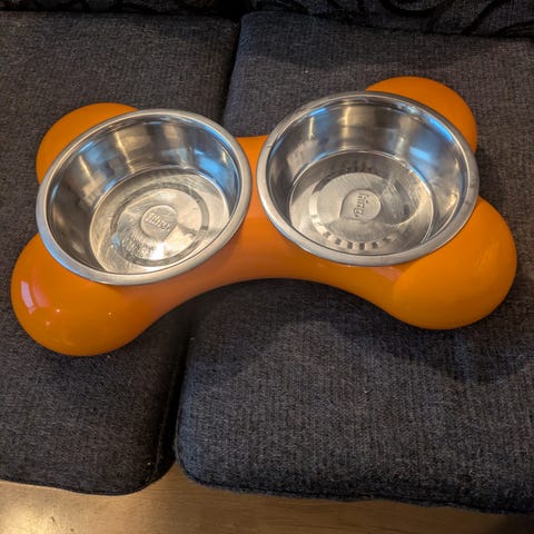 Ruostumatonta terästä. Ison koiran ruoka-ja juomakuppi telineellä. korkeus 15cm