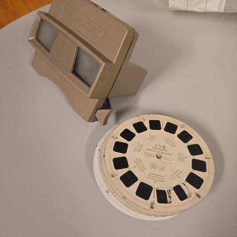 Walt Disney Movie Viewer elokuvakatselin, sininen väri, muovimateriaali. Sisältää valikoiman Walt Disney -hahmojen elokuvia, kuten Mikki Hiiri, Aku Ankka ja Hessu Hopo. Laite toimii filmikelausperiaatteella ja on tarkoitettu elokuvien katseluun ilman paristoja.