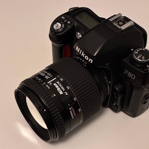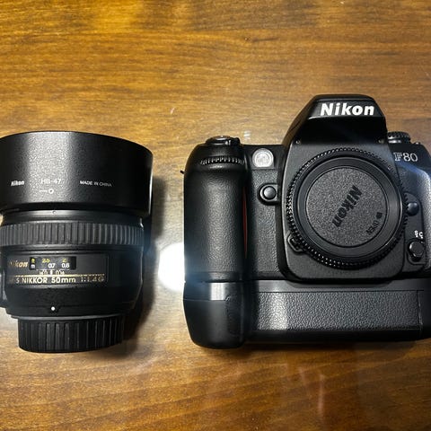 Siisti ja hyväkuntoinen, toiminnallisesti ehjä, vähällä käytöllä ollut Nikon F80 -filmikamerarunko. Kameramallille tyypillistä tahmeutta ei ole havaittavissa kameran kumipinnoilla.
