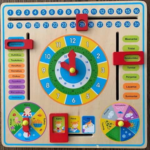 Puinen kalenteri vuodenaikojen, kuukausien, viikonpäivien, päivän, sään, vuorokauden ajan sekä kellon opetteluun.