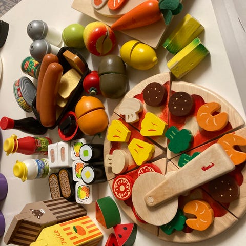 Puinen lelu, jolla voit luoda voileipiä. Mukana osat neljään leipään, osien järjestystä voi vapaasti vaihdella. Hauskaa leikkiä!