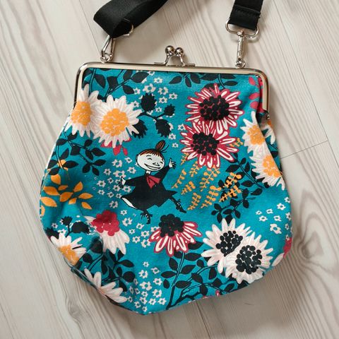Uudenveroinen mustvalkoinen Muumi-olkalaukku, onkohan käytetty kertaakaan, kenties kokeiltu.