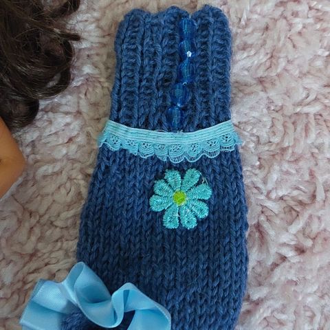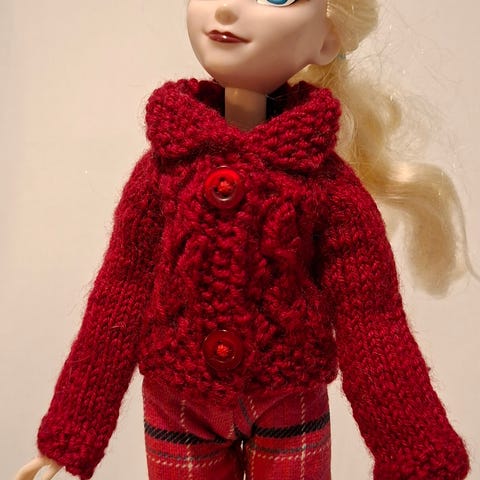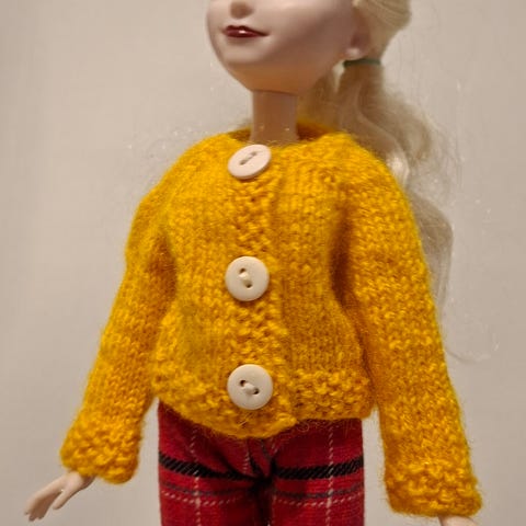Käsityötä. Neulottu villapaita. Edessä nappi. Nukke ei sisälly kauppaan.