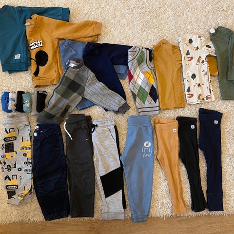 Myydään kuvien mukaisessa kunnossa oleva 86 vaatepaketti 18 kappaletta paitoja ja yksi jumpsuit