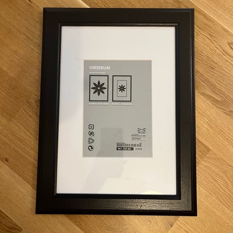 IKEA Ribba valokuvakehys, valmistettu puusta, ruskea väri. Kehys on tarkoitettu valokuvien tai taideteosten kehystämiseen ja seinälle ripustettavaksi tai pöydälle asetettavaksi.