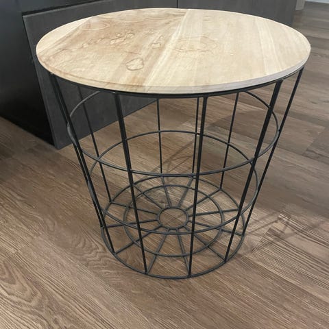 Kaunis, hyväkuntoinen metallinen koripöytä puisella kannella. Sopii täydellisesti sivu- tai sohvapöydäksi. Sisällä voi säilyttää esim. vilttejä. Korkeus 45cm, kannen halkaisija 45cm