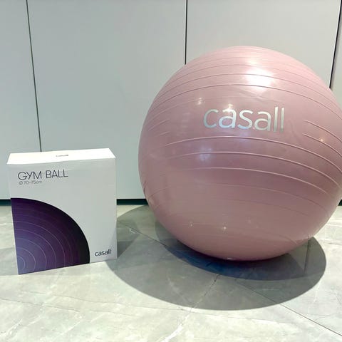 Pink exercise ball with icons of different exercise methods. Suitable for a variety of exercises and rehabilitation.