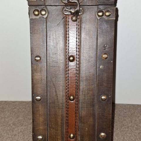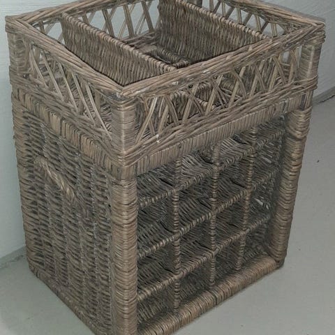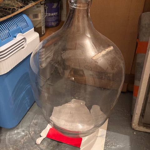 Myydään vanha viinipullo. Toinen rottinkikahva on rikki, muuten hyväkuntoinen. Korkeus noin 55 ja halkaisija 45cm.
