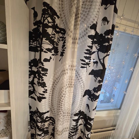 2 Vallilan valmisverhoa. Kissatalous, verhoissa voi olla kissankarvoja ja pieniä kynnenjälkiä.