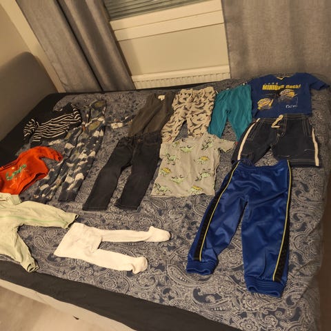 Pojilla käytössä olleita vaatteita. Shortseja, lippus, collegeja, takkeja, uimahousut, verkkareita ja collegehousuja. 7-12-vuotiailla ollut käytössä. Myydään kaikki könttänä.