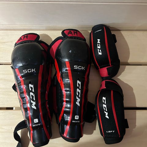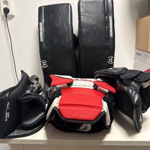 Jääkiekko varusteet sisältävät suojavarusteita kuten polvisuojat, käsisuojat ja rintapanssarin. Varusteet ovat mustia ja punaisia, suunniteltu jääkiekon harrastamiseen ja pelaamiseen.