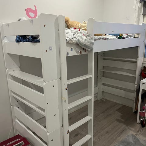 Myydään valkoinen Unipuun puoliparvisänky, jossa vaaleanpunaiset sivulaidat ja portaat. Pöydässä pyörät alla ja päädyssä hyllyt. Kunto hyvä käytetty, jokunen kolhu ja rikama löytyy. Toimiva kokonaisuus. Patjakoko 200cm x 80cm. Sängyn alle saa kivan majan ja leikkipaikan. Päätyhyllyille saa paljon leluja tai kirjoja jemmaan.