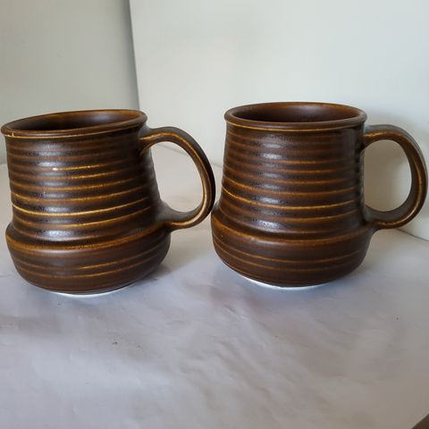 Arabia Tapsa-keraaminen muki. Ruskea raidoitettu pintaväritys, joka heijastelee valossa eri tavoin. Mukin pinta on lasitettu ja lasitus hohtaa jokaisessa mukissa hiukan eri sävyissä, mutta siniseen taittaen.