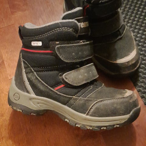 Kumppareissa vilkkuvalot ja irrotettava lämpövuori. Pinkit talvikengät parhaassa kunnossa, Reiman keltaisissa ja pinkeissä kumppareissa tummentumaa (ei ole yritetty putsata). Kaikki kuitenkin ehjiä ja käyttökelpoisia.