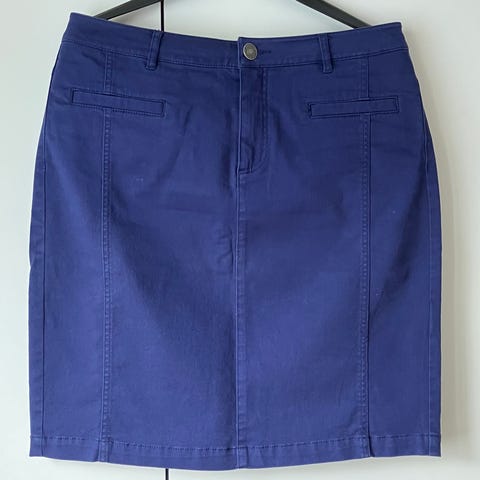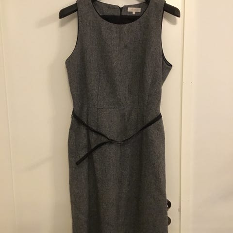 Myydään kauniisti laskeutuva mekko, jossa taskut ja edessä napitus.