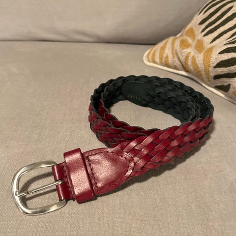 - Ruskea nahkainen vyö, jossa hopeanvärinen solki. Vyön leveys on kapea ja se on valmistettu aidosta nahasta.