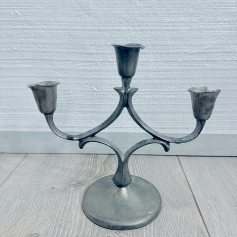 Tyylikäs Vintage-kynttilänjalka, jossa teak-puinen pohja ja kupariset kynttilänpidikkeet.