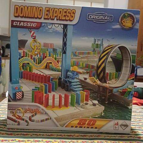 Domino Express Classic dominopalikkasetti, jossa on 80 osaa. Setti sisältää useita värikkäitä dominopalikoita ja erilaisia radan osia, kuten silmukoita ja käännöksiä. Sopii rakenteluun ja dominon kaatamiseen. Pakkaus sisältää myös käyttöohjeet.