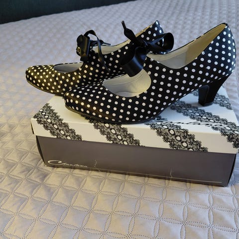 Chantanan juhlakengät numeroa 39. Muutaman kerran käytetty, mm korot moitteettomassa kunnossa. Kengän kärjissä kaunista kirjailua ja pieniä mustia paljetteja. Melko kapea malli, mutta hyvin mahtunut jalkaani joka yleensä vaatii suuremman koon.