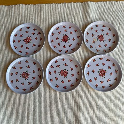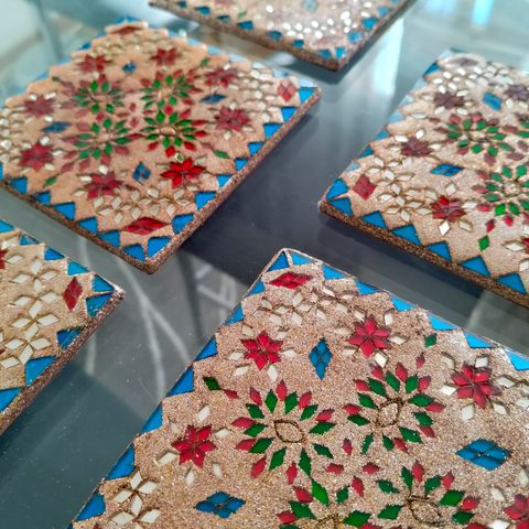 Myynnissä 4 kpl lasinalusia, joissa on kaunis valkoisella tehty kuvio. Materiaali on puristettua puuta. Nämä on ostettu Finnmarilta jokunen vuosi sitten ja ovat edelleen hyvässä kunnossa.
