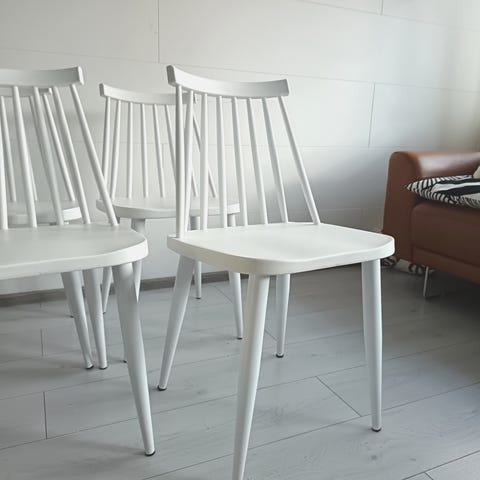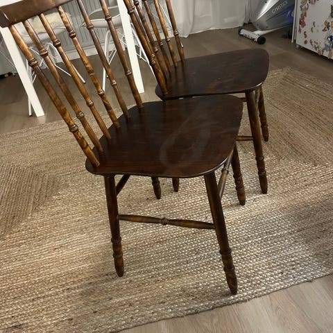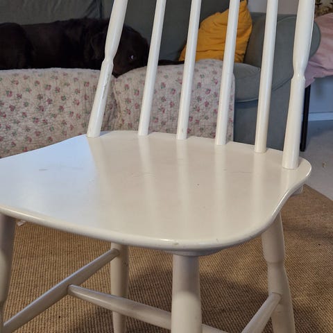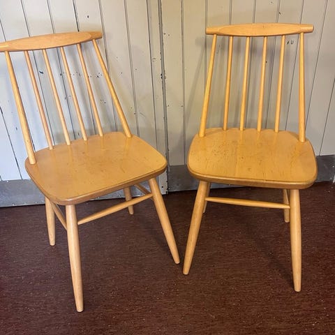 Istuinkorkeus 43 cm. Hieman kulumaa ja joitakin liitoksia kannattaa vahvistaa puuliimalla.