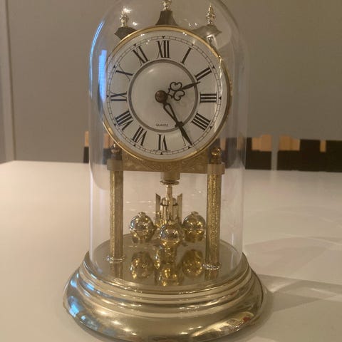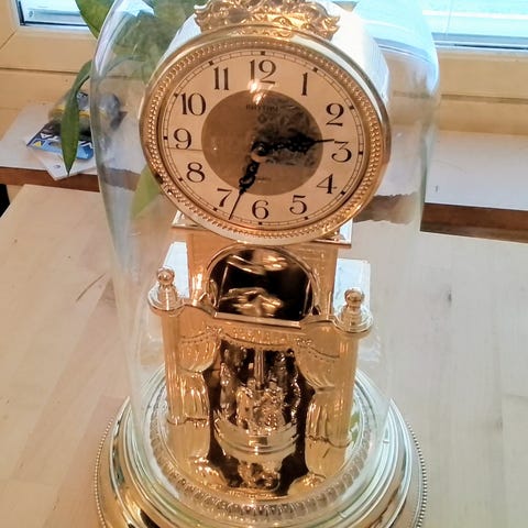Mekaaninen kello lasikuvulla, oikein siisti. Avain hukkunut, ei tietoa toimiiko.