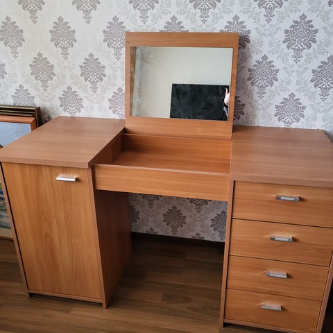 Täyspuinen ja jämäkkä peilipöytä, lakkaus on parista kohtaa kulunut.