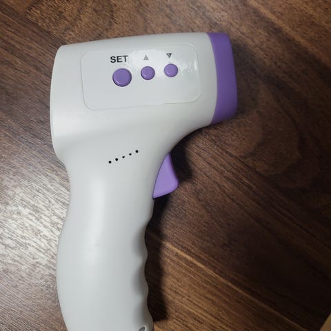 Lähes käyttämätön korvakuume mittari, jossa suojia vielä jäljellä.