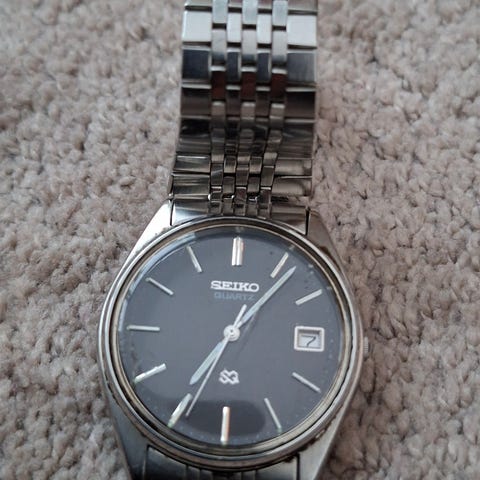 Täysin toimiva Seiko SQ -rannekello vuodelta 1979. Kellon kvartsikoneisto käy tarkasti ja pitää ajan, sekuntiviisari osuu täsmälleen indeksin kohtaan ja tuplapäivyri vaihtaa kuten pitääkin. 46 vuoden ikä näkyy hiukan Seikon kuorissa ja rannekkeessa, mutta ei niissäkään kovin pahoja naarmuja ole. Paristo on vaihdettu ja jousitapit uusittu joulukuun 2025 alussa.