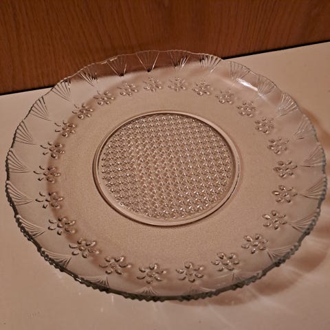 Lasinen tarjoilulautanen, jossa on koristeellinen kuviointi. Lautanen on kirkasta lasia ja soveltuu tarjoiluun tai koristekäyttöön.