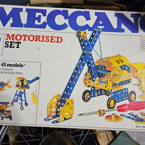 Mecano 2 rakennussarja esim. varaosiksi. Ei ole täydellinen setti, mutta alkuperäisessä laatikossa ja ohjekirjakin on. (kts.kuva)