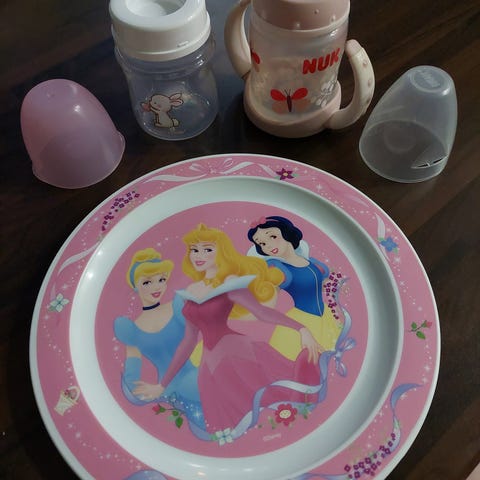 Kaksi nuk-mukia, taikamuki sekä kaksi muovilusikkaa.