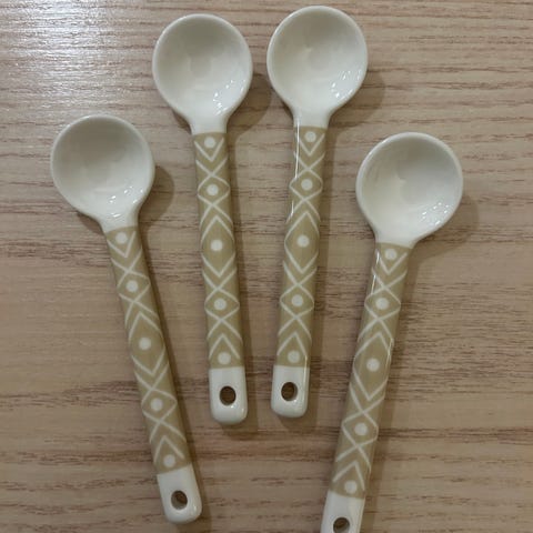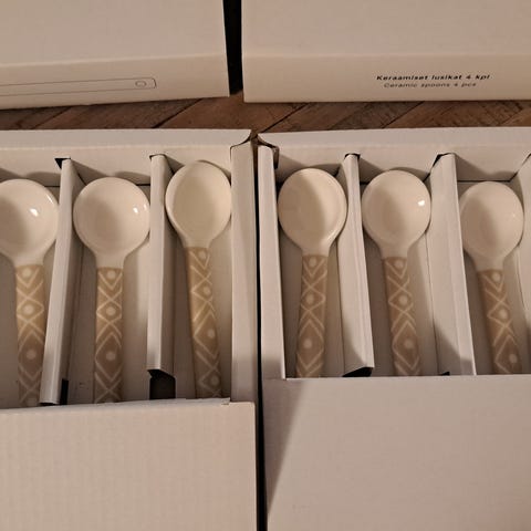 Myydään Marimekon valko-beiget keraamiset lusikat. Pakkauksessa on neljä lusikkaa. Uudenveroiset. Olleet pitkään vain omassa laatikossaan kaapissa.