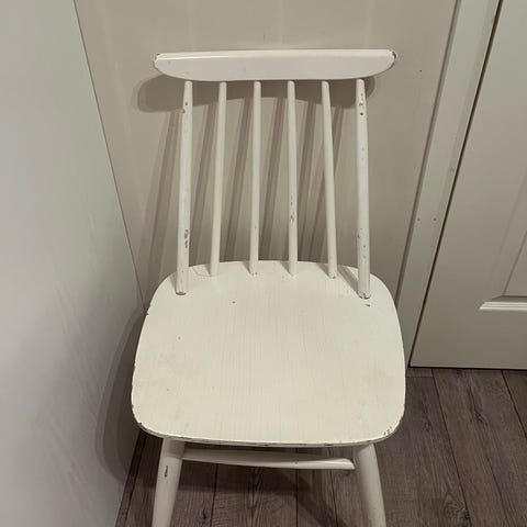 Myynnissä 4 kpl vintage pinnatuoleja. Pinnat tasaisen tuntoiset, lakkauksen alla näkyvissä jälkiä ja laikkuja. Osassa tuoleista pohjassa kulunut leima.