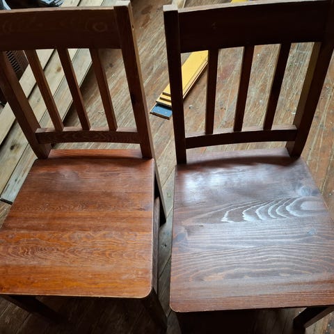 Neljä kappaletta koivupuisia tuoleja. Selkänojan yläpuusta on lakkaus kulunut, mutta muuten tuolit ovat ehjät. Istuinosan korkeus on 42,5 cm. Hinta on per kappale. Kaikki neljä yhteensä 30 €. Vain nouto Linnunlahdelta.