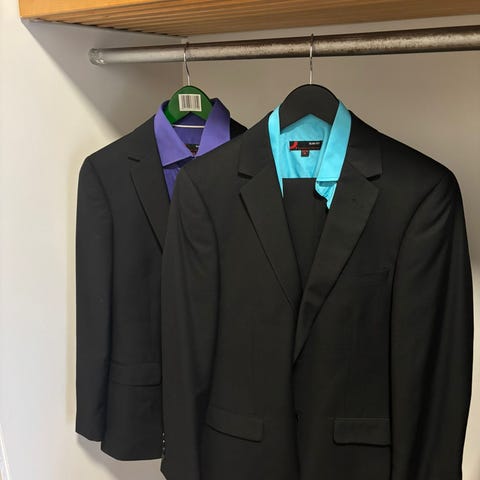 Dressmannin tuotekuvaus puvusta (takki + housut): ”Materiaalivalinnat takaavat mukavuuden ja kestävyyden: viskoosi ja elastaani tekevät puvuntakista pehmeän ja joustavan, mikä varmistaa mukavan istuvuuden ja liikkumavapauden. Polyesteri ja elastaani lisäävät kestävyyttä, mikä tekee bleiseristä pitkäikäisen ja kulutusta kestävän. Kangas säilyttää muotonsa, vähentää ryppyjä ja hengittää hyvin, joten se soveltuu erinomaisesti eri sääolosuhteisiin. Kuivapesu.